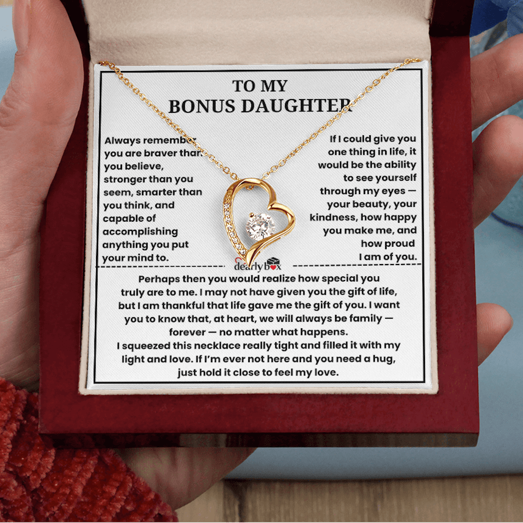 TO MY BONUS DAUGHTER Always remember you are braver than you believe, stronger than you seem, smarter than you think, and capable of accomplishing anything you put your mind to. If I could give you one thing in life, it would be the ability to see yourself through my eyes — your beauty, your kindness, how happy you make me, and how proud I am of you. Perhaps then you would realize how special you truly are to me. I may not have given you the gift of life, but I am thankful that life gave me the gift of you. I want you to know that, at heart, we will always be family — forever — no matter what happens. I squeezed this necklace really tight and filled it with my light and love. If I’m ever not here and you need a hug, just hold it close to feel my love.
